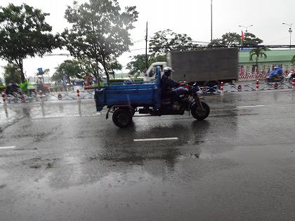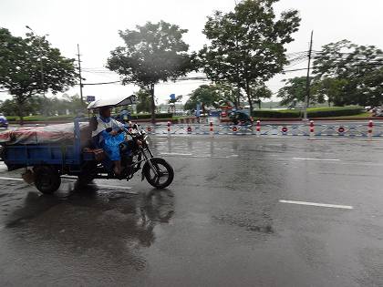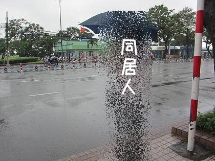 雨のサイゴン川前で カメラを片手に立ち尽くす同居人